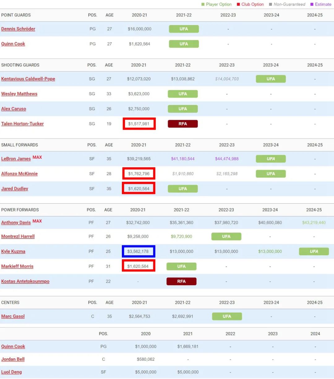 交易塔克——或者其他有一定工資級別的球員——湖人缺乏足夠的籌碼。他們沒有選秀權,工資見頂,只能近乎對等地交易。塔克最後一年的工資接近800萬,湖人需要送出至少640萬才能匹配。而且,交易完成後,湖人的工資總額不能超過1.39億,這是他們的硬天花板。