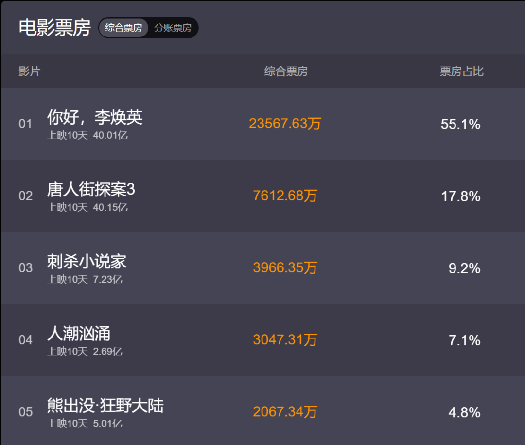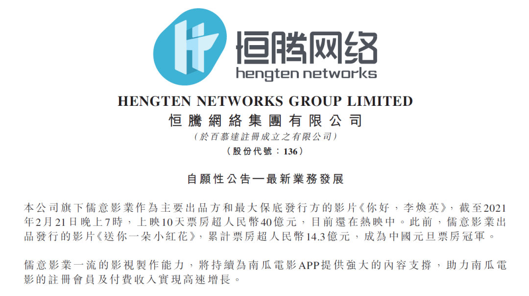 2月21日,恆騰網絡發佈公告,旗下儒意影業作為主要出品方和最大保底發行方的影片《你好,李煥英》,上映10天票房超40億元。