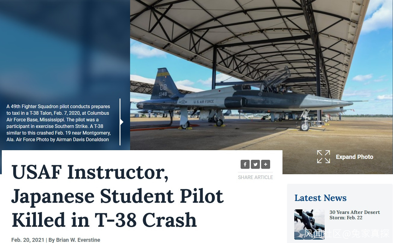 美媒《空軍雜誌》報道,當地時間2月19日,T-38C在阿拉巴馬州蒙哥馬利附近的丹妮莉機場(Dannelly Field)墜毀時,一名美國空軍飛行教練和日本航空自衞隊飛行學員死亡。