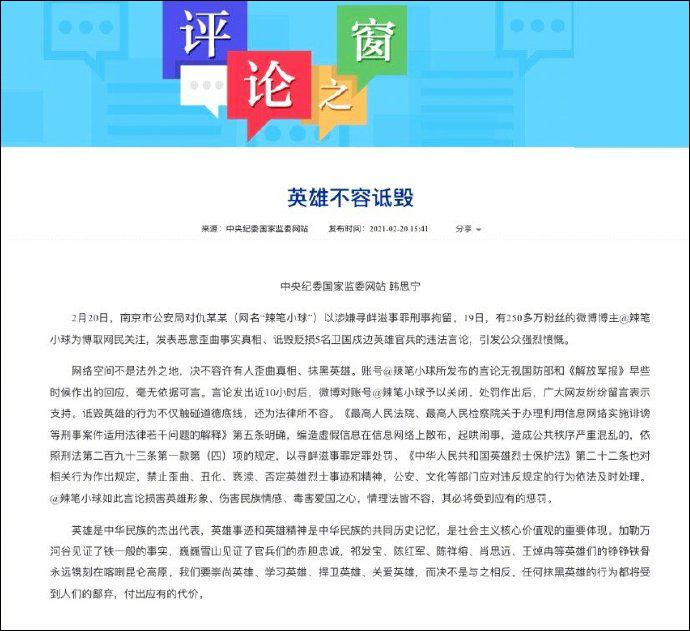 中紀委評“辣筆小球”被刑拘:任何抹黑英雄的行為都將付出代價_風聞