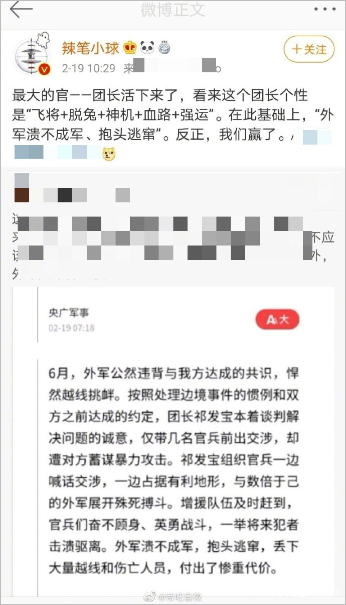 19日,有250多萬粉絲的微博博主@辣筆小球 為博取網民關注,發表惡意歪曲事實真相、詆譭貶損5名衞國戍邊英雄官兵的違法言論,引發公眾強烈憤慨。