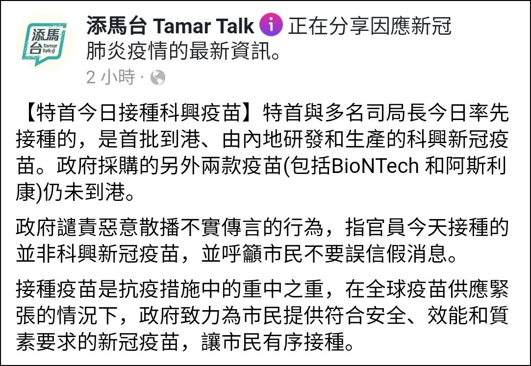對此,港府“添馬台Tamar Talk”臉書專頁於下午6時許做出澄清,強調林鄭月娥和其他司局長率先接種的,是首批到港、由內地研發和生產的科興疫苗。