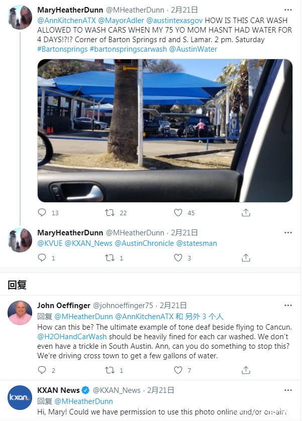 居民瑪麗·希瑟·鄧恩(Mary Heather Dunn)在推特上發佈了一張Barton Springs洗車場的照片,他説:“當我75歲的媽媽四天沒喝水時,怎麼能允許這家洗車公司洗車?!”