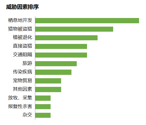我列出了幾個主要威脅並加以排序:1.棲息地的開發;2.盜獵(包括獵物的盜獵);3.植被退化。