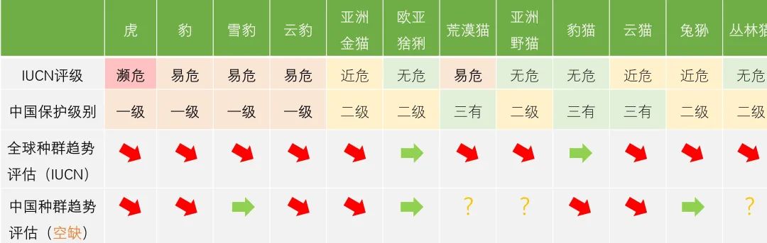 IUCN評估全球所有的貓科動物的種羣趨勢基本都在下降。而在中國的情況可能更加糟糕。