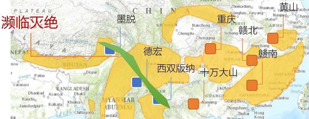 但結果是所有華南地區都已經拍不到雲豹了,只有西南邊境地帶拍到。下圖就是我們估計出來的中國最樂觀的分佈區域。