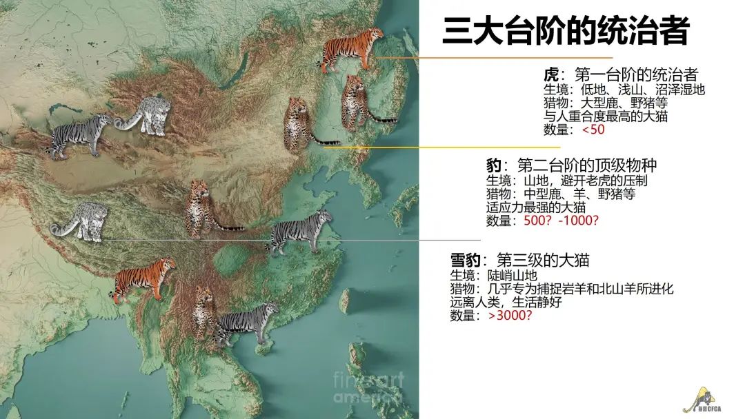 再來看第三台階的統治者雪豹。雪豹是中國大型貓科動物裏境況最好的一個,它喜歡的生境和虎豹不一樣,非常適應陡峭的山地,分佈區域可以到達海拔5000米。