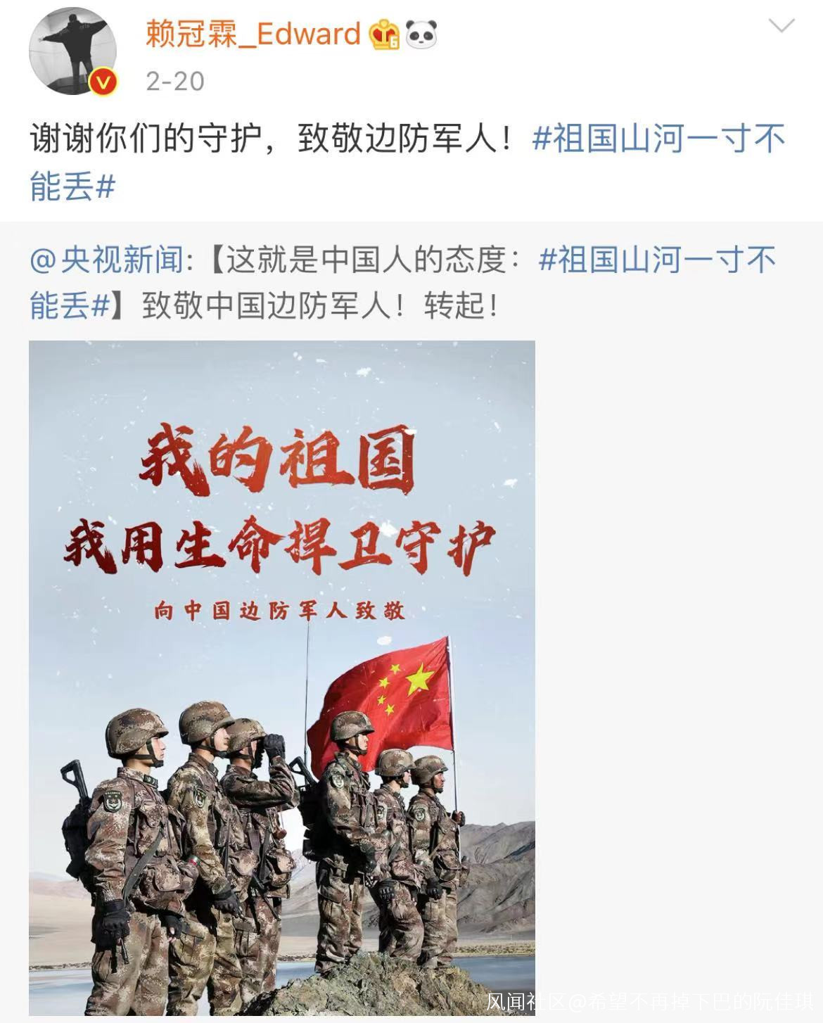 諸多明星藝人轉發了@人民日報 和@央視新聞 博文,對這些勇敢堅毅的國土守護者表示致敬與感謝,其中就包括中國台灣藝人歐陽娜娜和賴冠霖。