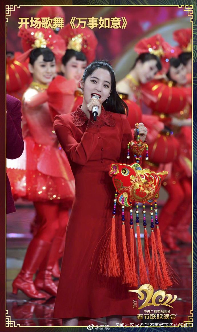 春晚上,歐陽娜娜與兩岸三地的藝人們一起合唱開場節目《萬事如意》,一身喜慶紅衣高唱“歡天喜地大中國,一年更比一年好”,與全球華人共賀春節。