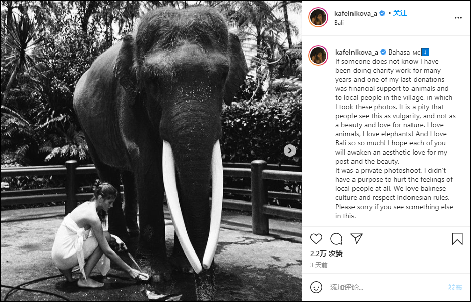 她強調自己愛動物、愛大象,也熱愛巴厘島文化,尊重印尼規則。“如果你在其中看到了其他東西,請原諒我。”
