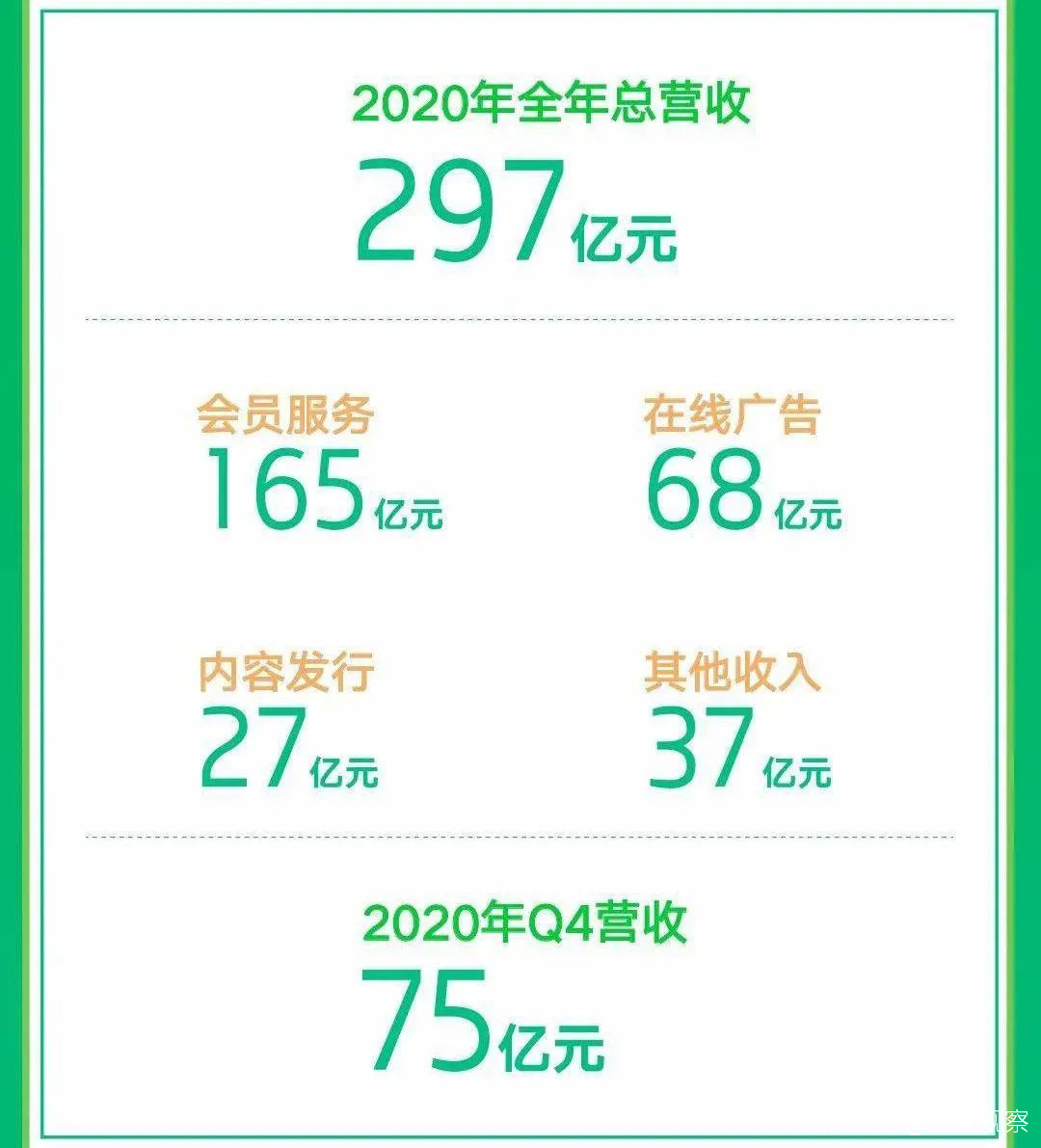 而對應到去年四季度,其會員服務收入為38億元,同比減少1%;在線廣告收入為19億元,同比減少1%;內容發行收入為8.043億元,同比減少8%。2020年全年,其會員服務收入同比增長14%至165億元;在線廣告收入同比下降18%至68億元;內容分發收入同比增長5%至27億元。