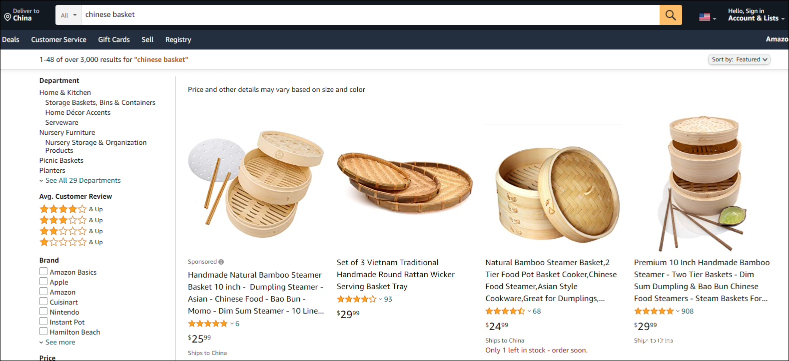 目前,亞馬遜網站上的痰盂商品大都已經下架。在搜索欄輸入“chinese basket”等相關詞彙,已經無法搜到痰盂。