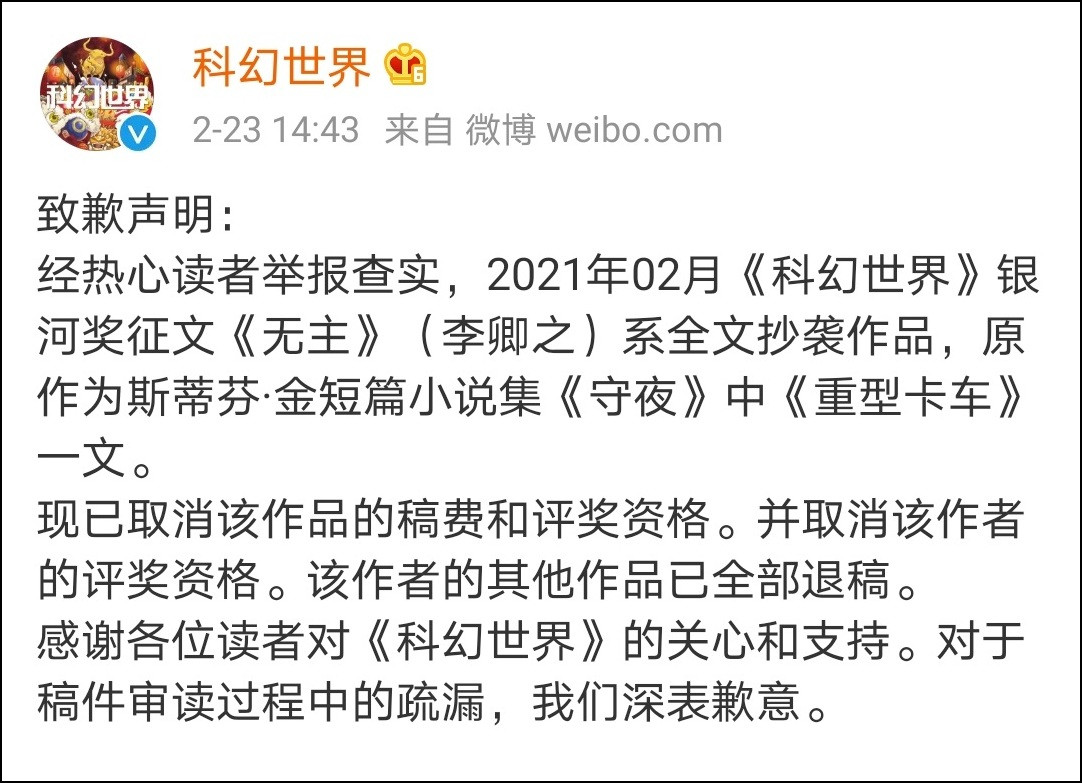 日前,網傳雜誌《科幻世界》2021年2月刊上的文章《無主》存在嚴重的抄襲問題。23日下午,《科幻世界》在其官方微博上發表致歉聲明證實此事。