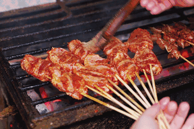 站在攤邊,一雙雙眼睛隨着師傅的動作上下左右瞟動,恨不得立馬就把這些撒滿孜然、辣椒麪的燒烤吃進肚子裏。