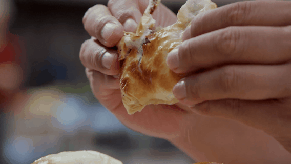 看着師傅把原本白色的包子烤至金黃後拿出,期待着它進入自己口中的那一刻。