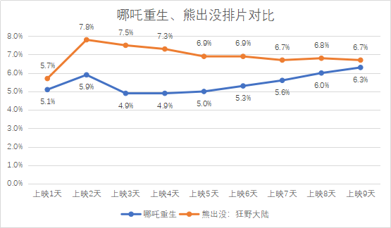 從兩部影片的排片看,儘管上映前期《熊出沒》的排片始終高於《哪吒重生》,隨着後者口碑的發酵,院線給《哪吒重生》的排片逐漸上升,熊大熊二身後,哪吒窮追不捨。在“寸場寸金”的春節檔,影院安排給動畫電影的場次總體上是有限的,《哪吒》的出現其實也從一定程度上擠佔了《熊出沒》的排片率。過去幾年的春節檔中,《熊出沒》一家獨佔10%左右的排片,而今年春節檔的首日《熊出沒》+《哪吒》才分得10.8%的排片率。