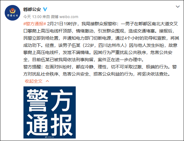 據@郫都公安 發佈的通報稱,經查,該男子伍某(22歲,四川達州市人)因與他人發生糾紛,故意攀爬上高壓電線杆,發泄不滿情緒。因其行為嚴重擾亂公共秩序,危害公共安全,目前伍某已被該局依法刑事拘留,案件正在進一步辦理中。