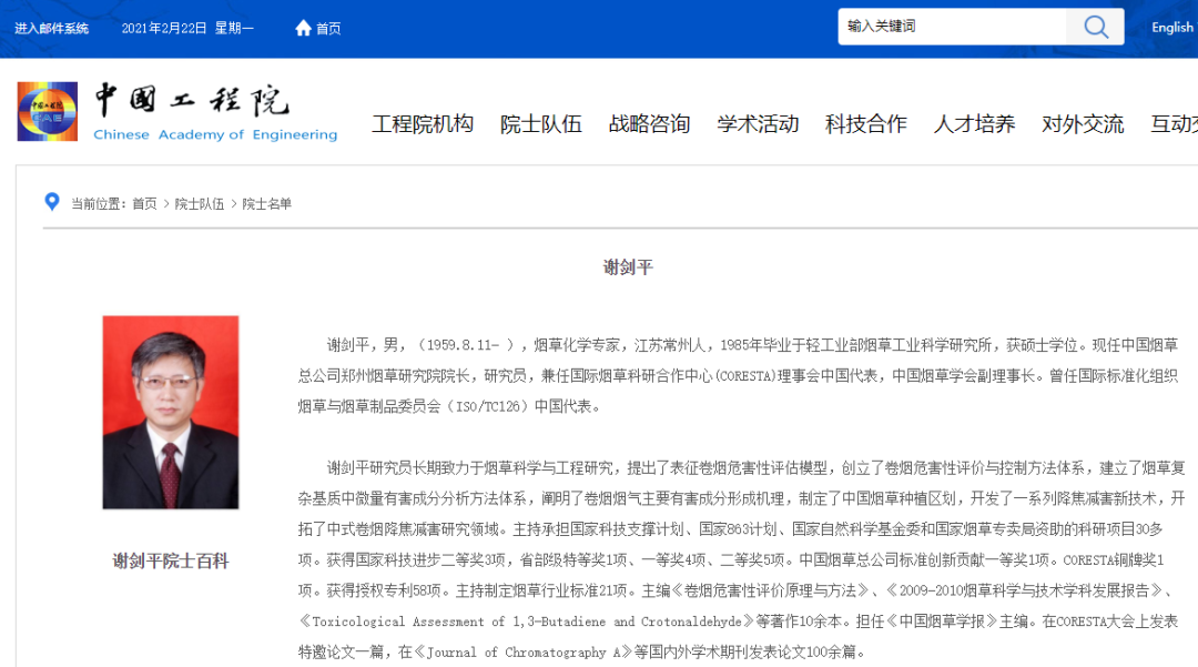 謝劍平是中國煙草總公司鄭州煙草研究院研究員,其當選院士主要靠的是在煙草中“降焦減害”方面的研究成果。