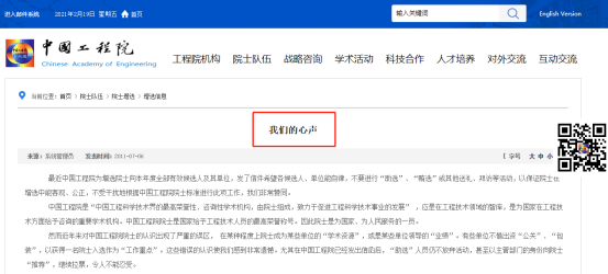 在中國工程院官網上,至今掛着一篇十年前的文章,這篇文章於2011年5月,由中國工程院院士聞玉梅與其他3名院士聯名發表,名為《我們的心聲》。