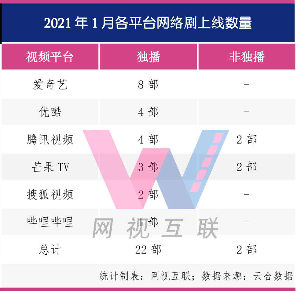 據云合數據,剔除電視劇及10分鐘以下的短劇之後,1月份全網上線的網絡劇共24部,其中12部為獨播,2部為多平台聯播。