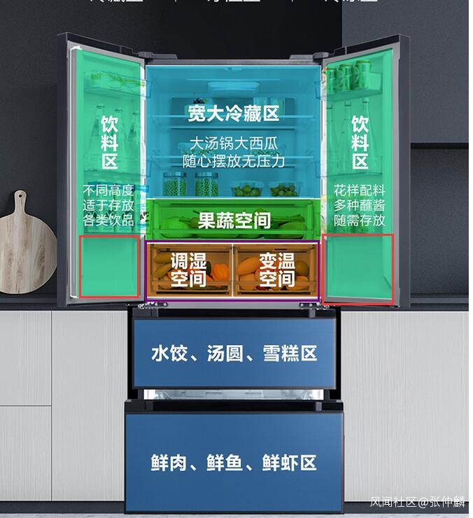 又比如下圖這個國產多開門冰箱,雖然用833mm的寬度達成了508L的容量,勉強滿足了大容量的要求,但是門內側飲料區最下面一層格子的取消(紅框處)以換取變温區更大的空間(紫框處)卻並不太合理。這需要佔用冷藏區來擺放飲料或者調味品,反而浪費了更多的空間,所以不滿足分隔合理的要求。