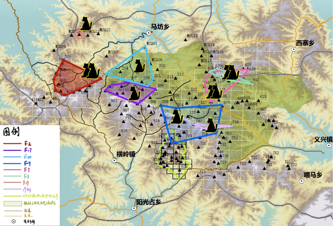 16年的時候,我們在和順記錄到了16只華北豹定居個體,但是到了2019年,這16只帶固定編號的豹子,已經更替到只剩下8只(公豹M1、M2、M5;母豹F2、F4、F7、F8、F9)了。