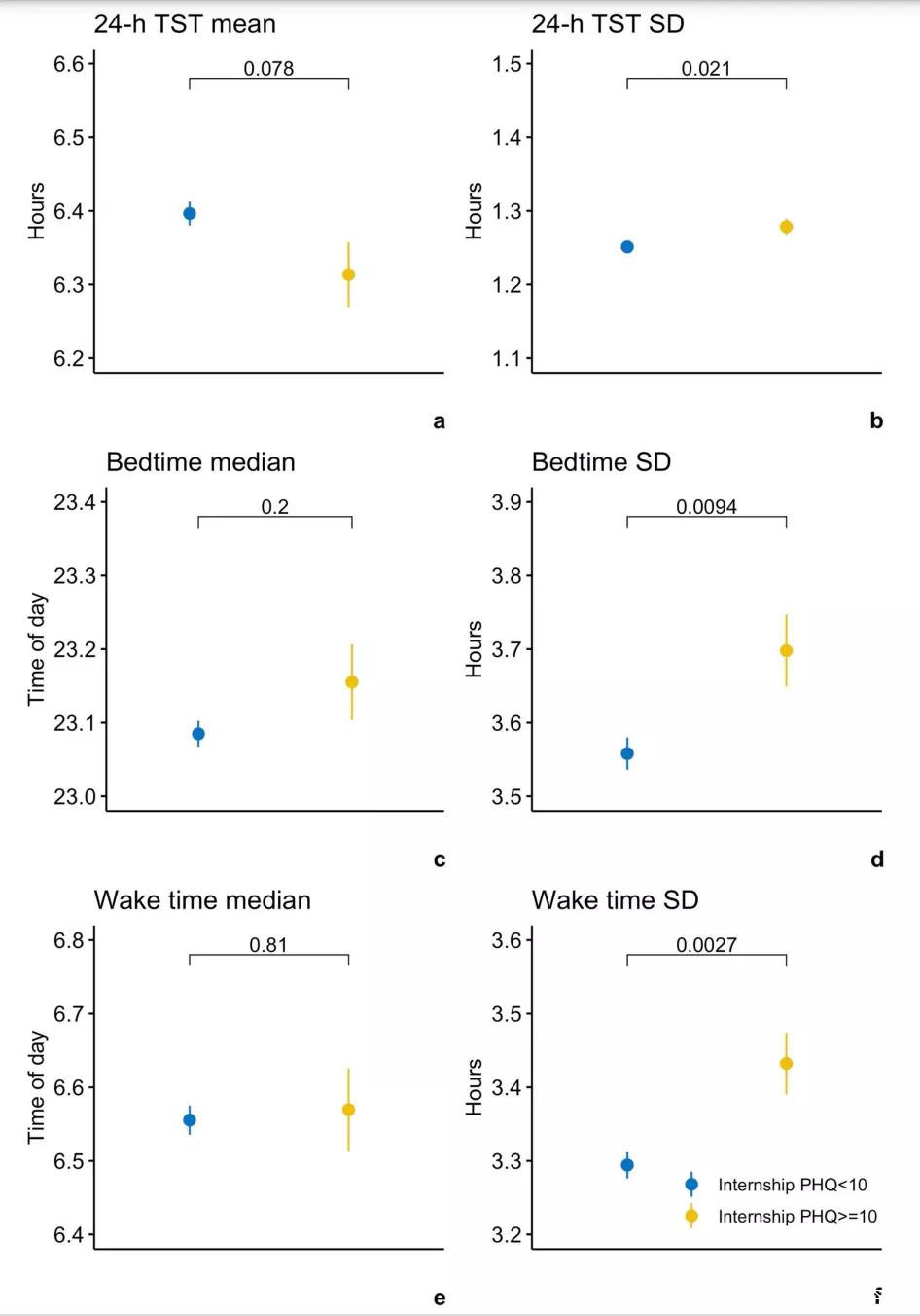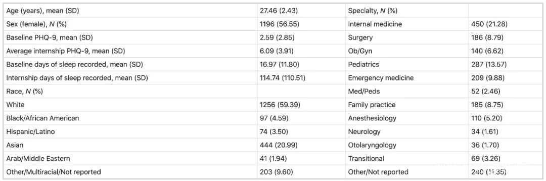 該研究納入了隊列2115名(56%為女性;年齡27.5±2.4歲)實習醫師。他們的基線PHQ-9(9項患者健康問卷)評分和平均實習期PHQ-9評分的平均值為2.59(±2.85)和6.09(±3.91)。在基線期和實習年分別收集了平均17(±12)天和115(±111)天的睡眠記錄。