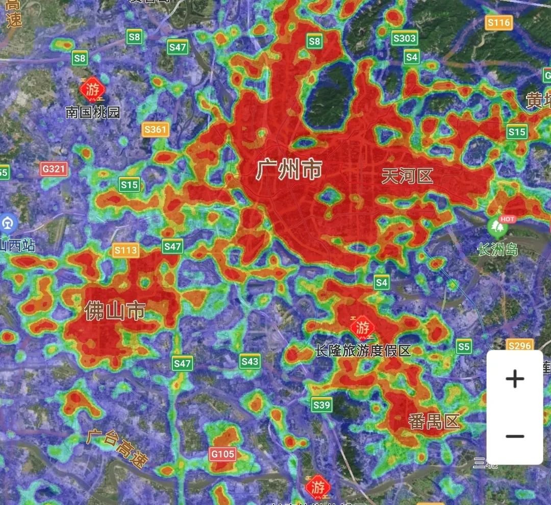 **其中,**廣佛基本連成一體,城市邊界幾近消失,堪稱中國最成熟的都市圈之一,這從城市熱力圖就可見一斑。