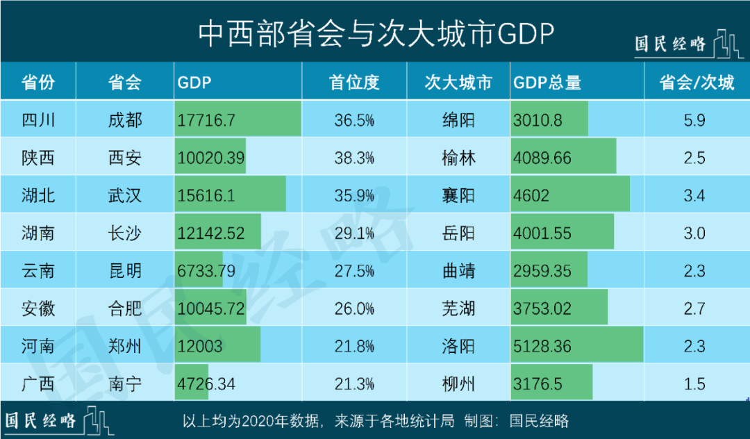 從省會GDP佔全省GDP比例來看,長春、銀川超過50%,西寧超過40%,西安、哈爾濱、成都、武漢、拉薩、海口、蘭州超過30%,而石家莊、呼和浩特、南京、濟南不足20%。