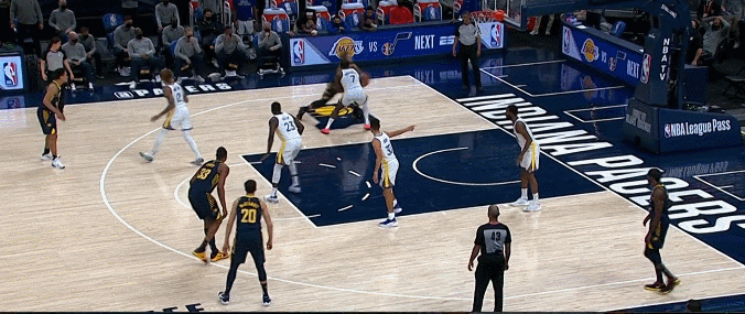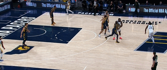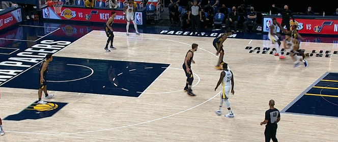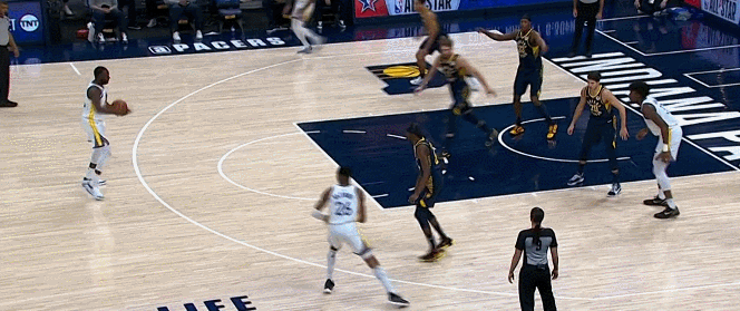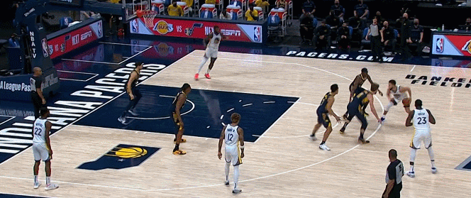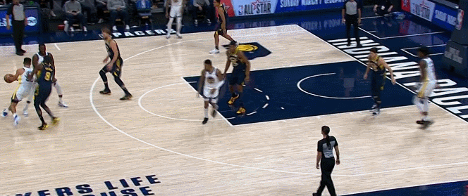 而這個中距離的機會是這麼來的:庫裏在三分線右側和帕斯卡爾發起擋拆,步行者的陣型是上線雙人夾擊,下線三人隨時準備協防。庫裏突破無路,看似要把球回給格林了,於是步行者想換回聯防的陣型。