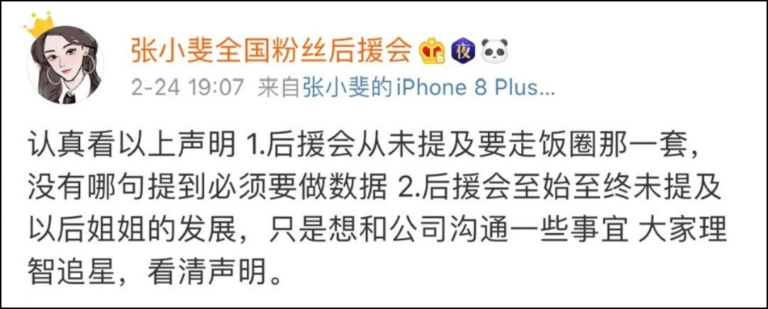 因為張小斐團隊不予回應,所以@張小斐全國粉絲後援會 表態不將張小斐定位為流量明星,希望喜歡張小斐的粉絲都能理性看待、理智追星。