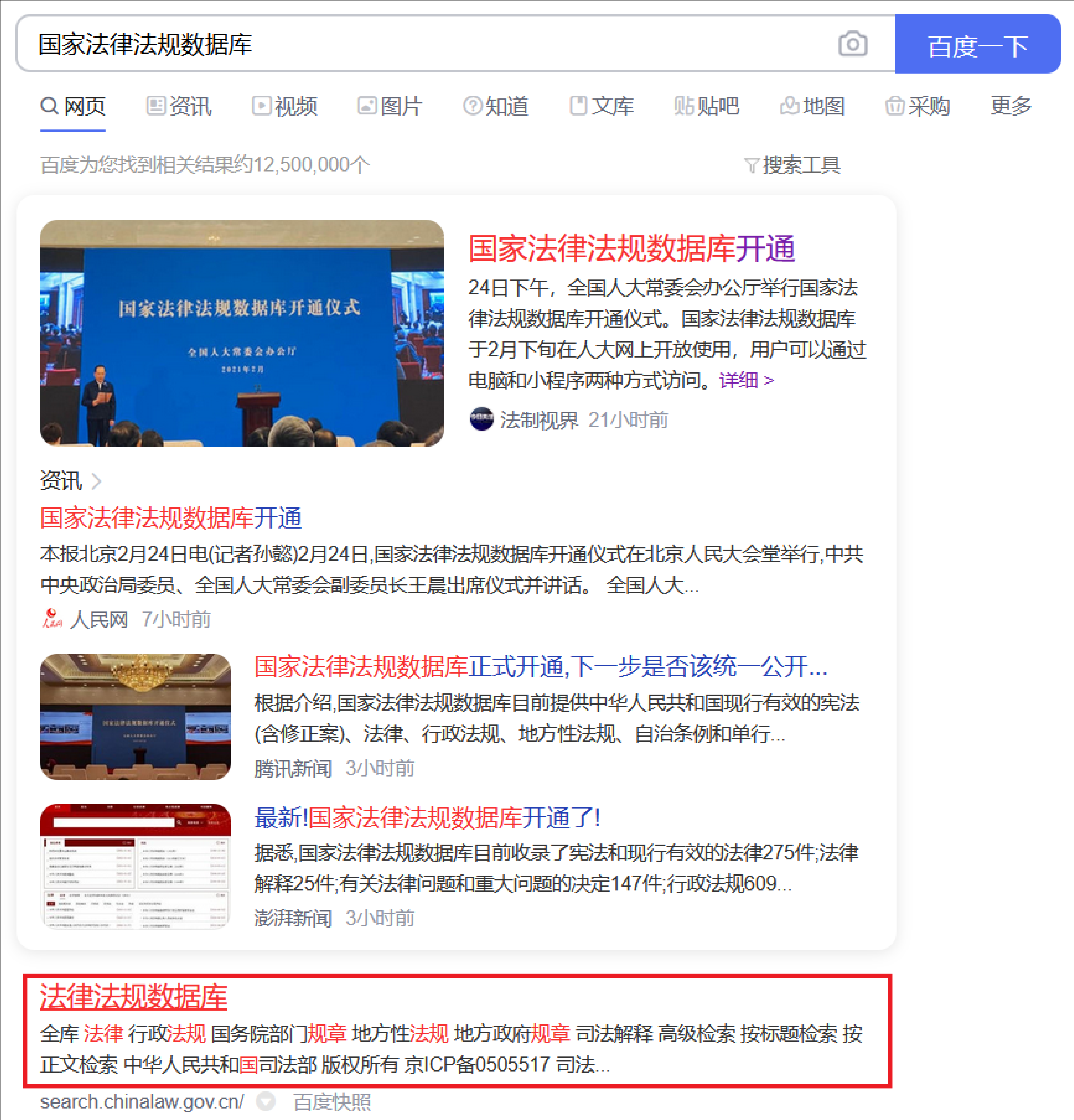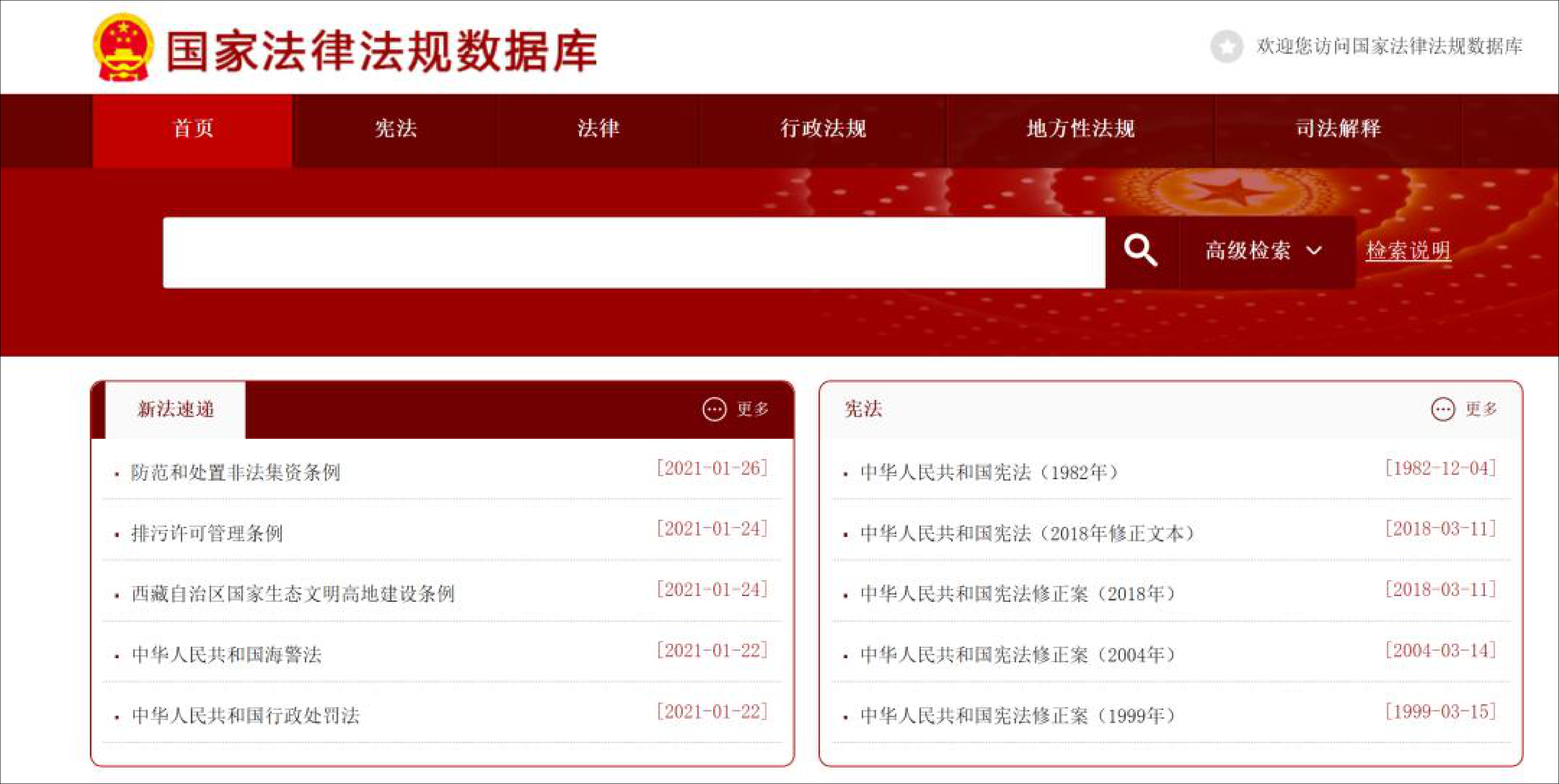 “法律法規數據庫”位於中國政府法制信息網(暨司法部官網),收錄了我國的法律、行政法規、地方性法規、行政規章、司法解釋等法律文件。