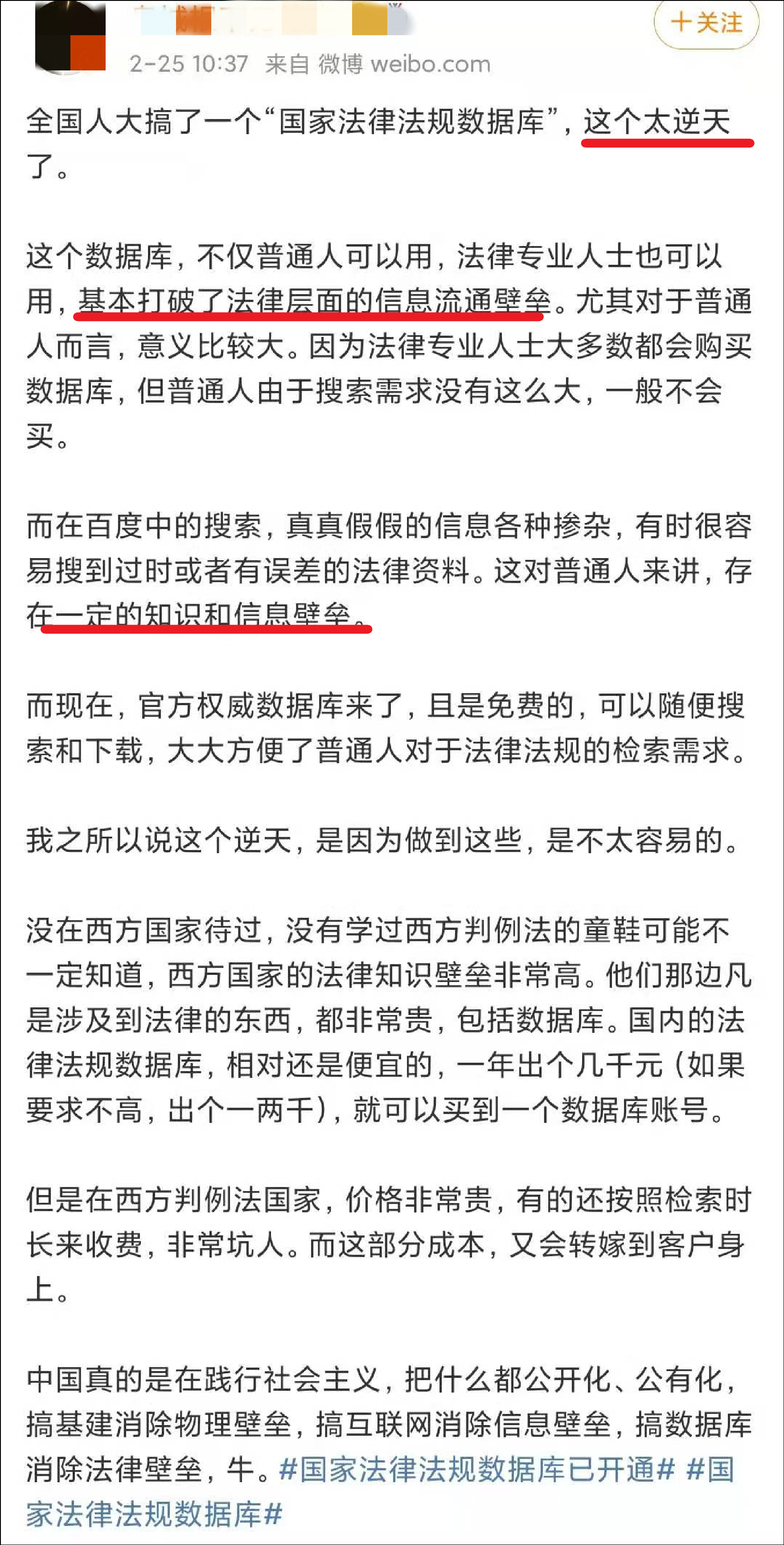 認為國家法律法規數據庫“逆天”的網友還表示,在該平台上線之前,網上“真真假假的信息各種摻雜,有時很容易搜到過時或者有誤差的法律資料。這對普通人來講,存在一定的知識和信息壁壘”。
