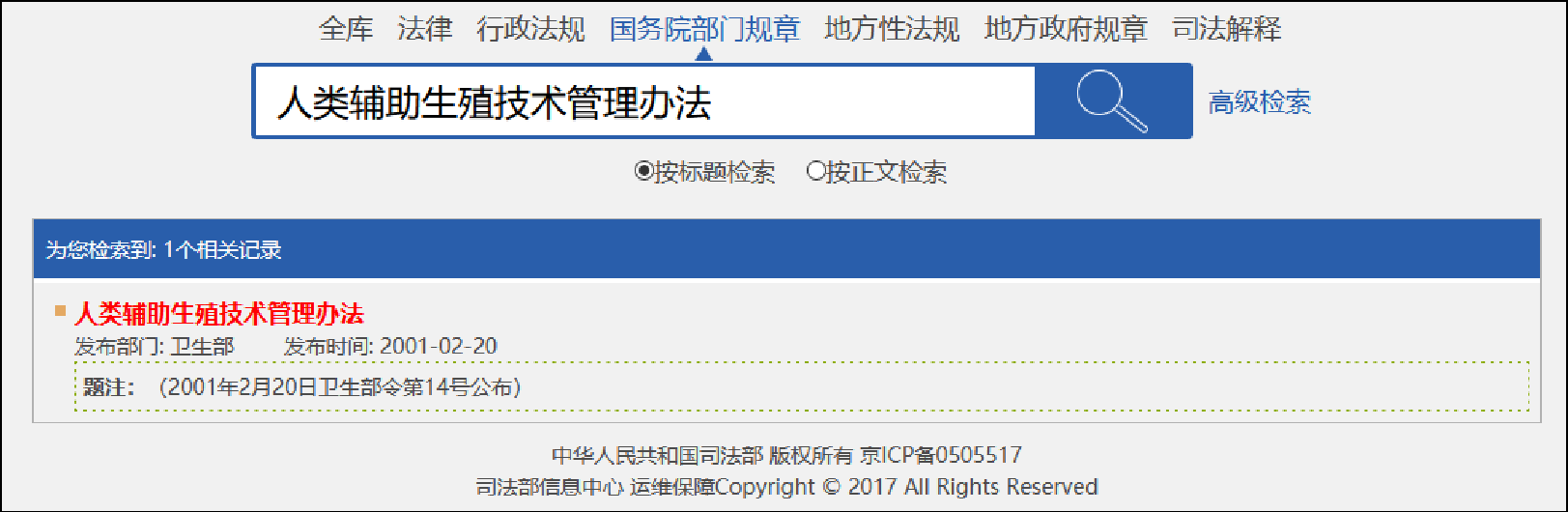 “法律法規數據庫”檢索到了《人類輔助生殖技術管理辦法》