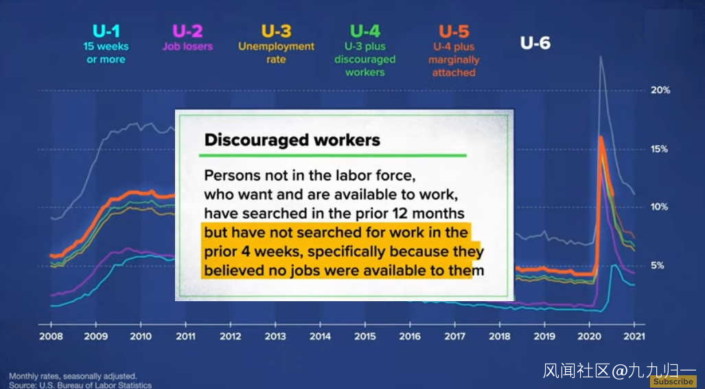 第六個指標,U6,就是臨時工,兼職,或者工作不足的人羣,這些都是有工作能力,但找到不到能完全滿足自己資薪的人羣,加上U5的人數。