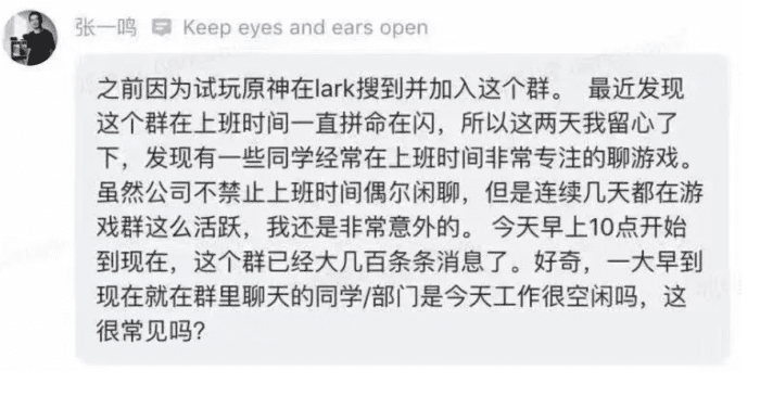 隨後, 張一鳴的擔憂以更公開的方式表現出來。面對工作時間,字節跳動內部的《原神》遊戲興趣羣蹦出幾百條信息,張一鳴發出一條疑問:“一大早到現在就在羣裏聊天的同學 / 部門是今天工作很空閒嗎?這很常見嗎?”張一鳴“卧底”也釋放了一個信號:字節跳動的組織在不停迭代,需要再擰緊一下發條了。