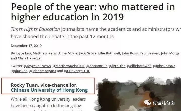其實,段校長能講出這種話,所有人都不應該感到吃驚。大家是否還記得,就在去年,段校長還曾獲得一項“殊榮”——由英國教育報刊《泰晤士高等教育》評出了11位“2019年教育界年度人物”,段崇智是唯一一位上榜的亞洲代表。而他的獲獎理由為:在香港高校領導人捲入示威風波時,“無人像段崇智一樣堅定地為校園及學生挺身而出”,“即使飽受批評,他仍堅持其平衡各方意見的行動”。
