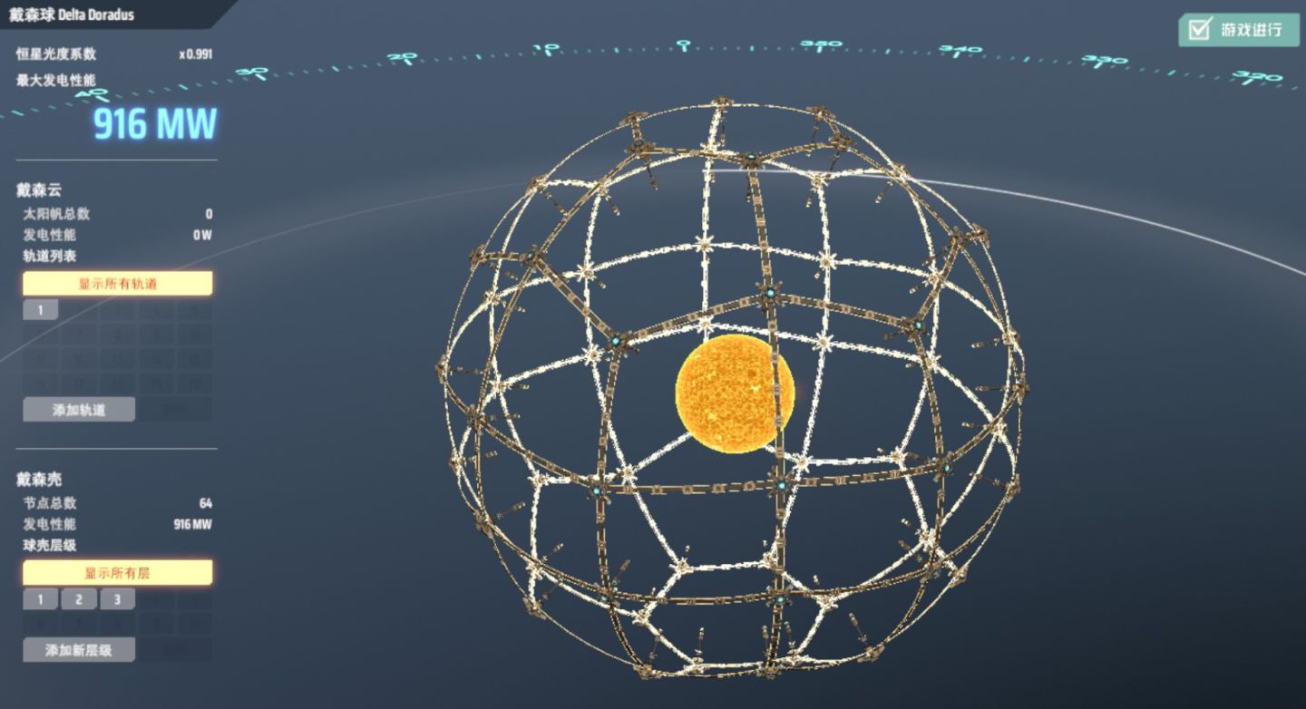 遊戲中戴森球實際的建造過程大致分為節點和殼面兩個部分。在恆星的特定高度軌道上,每30個小型運載火箭可搭建一個節點,這構成了戴森球的整體骨架,節點越多則戴森球的發電功率越大,但成本顯然也越高。節點之間的空隙為殼面,玩家可以發射相對廉價的太陽帆來填充,以吸收更多的太陽能。