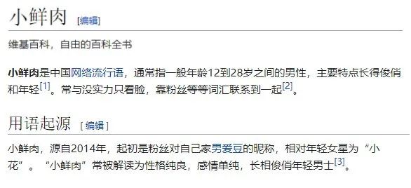 但是在維基百科上,小鮮肉的定義後面還跟了一句話,“常與沒實力只看臉,靠粉絲等等詞彙聯繫到一起”。