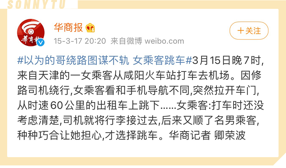 因為司機偏航、順路接男乘客,誤認為認為司機圖謀不軌,選擇跳車: