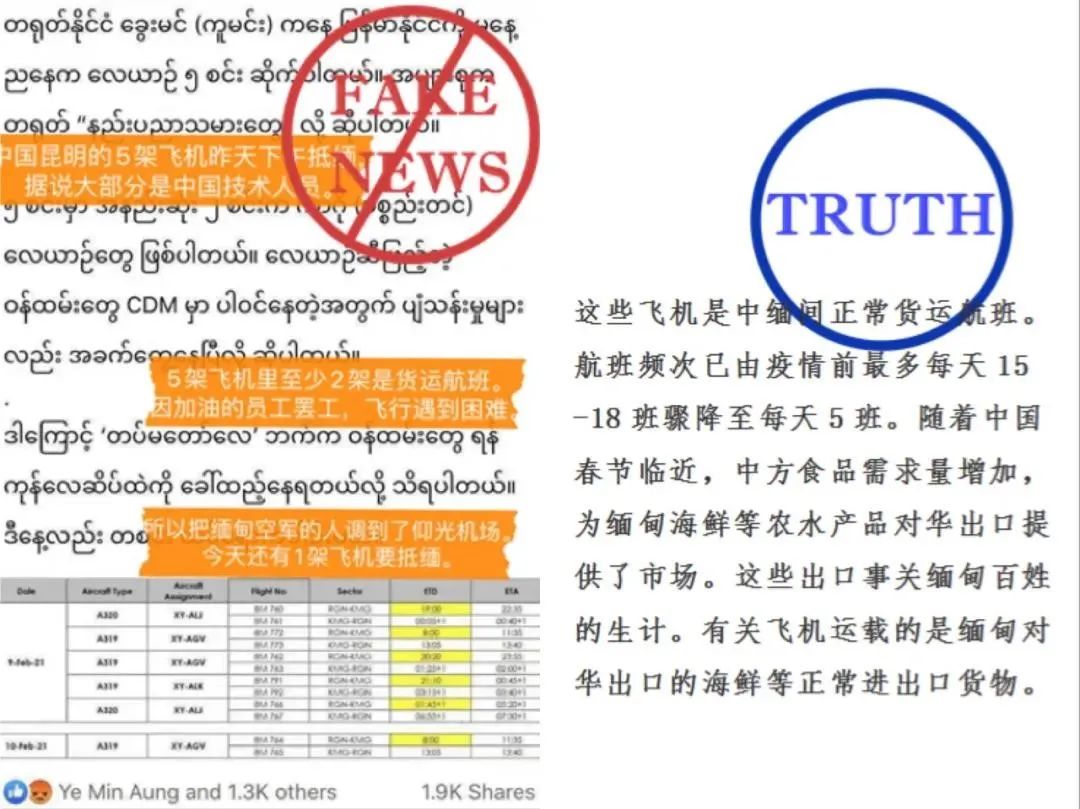當時的緬甸社交媒體上傳出一種怪論,説什麼“中國的5架飛機抵達緬甸,據説大部分是中國技術人員,為的是幫助緬甸軍方建立防火牆”。