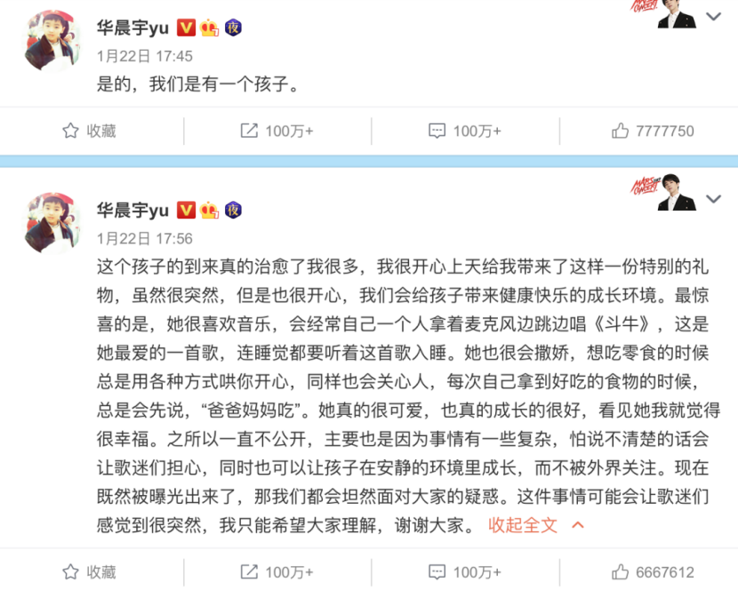 參考不久前華晨宇關於與張碧晨孕育一子的回應相,言簡意賅,直接承認“是的,我們有一個孩子”,第一時間告知公眾與粉絲事實,在張碧晨長文之後,再發長文細數新手爸爸的温馨心路歷程,成功轉移注意力。