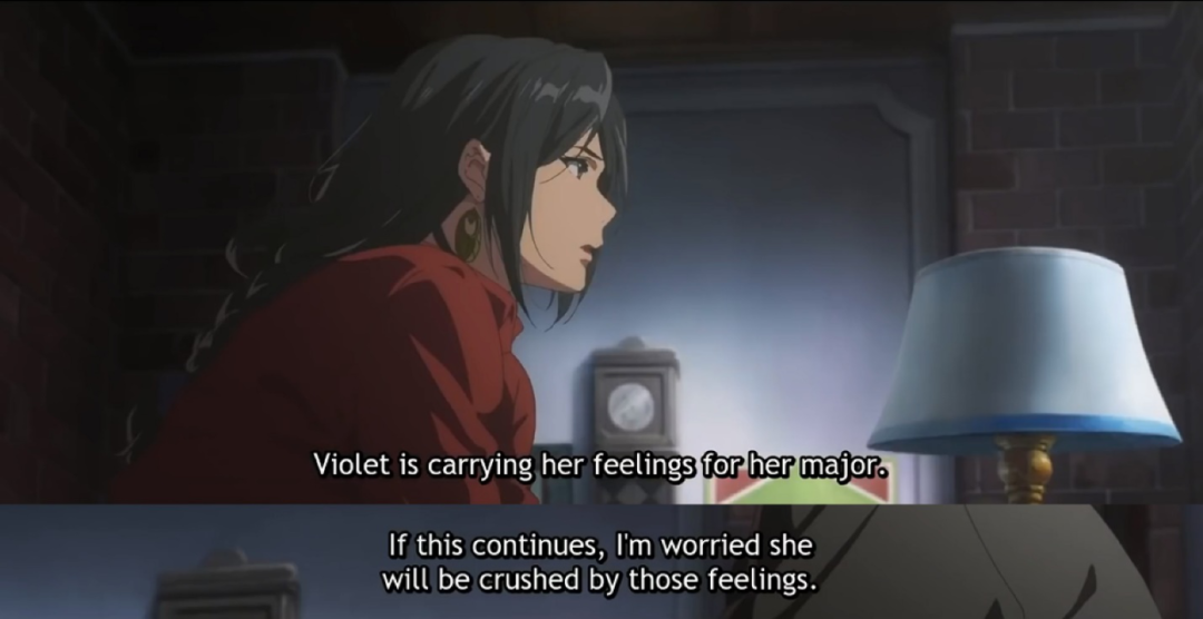 就像在預告片裏嘉德麗雅説的:“薇爾莉特依然忘不掉少校,這樣下去,我擔心她會被她自己的這份感情所傷。”