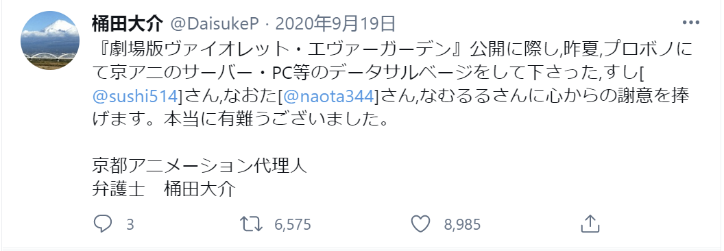 京阿尼的律師桶田大介在推特感謝了去年幫助京阿尼恢復電影相關數據的技術人員。