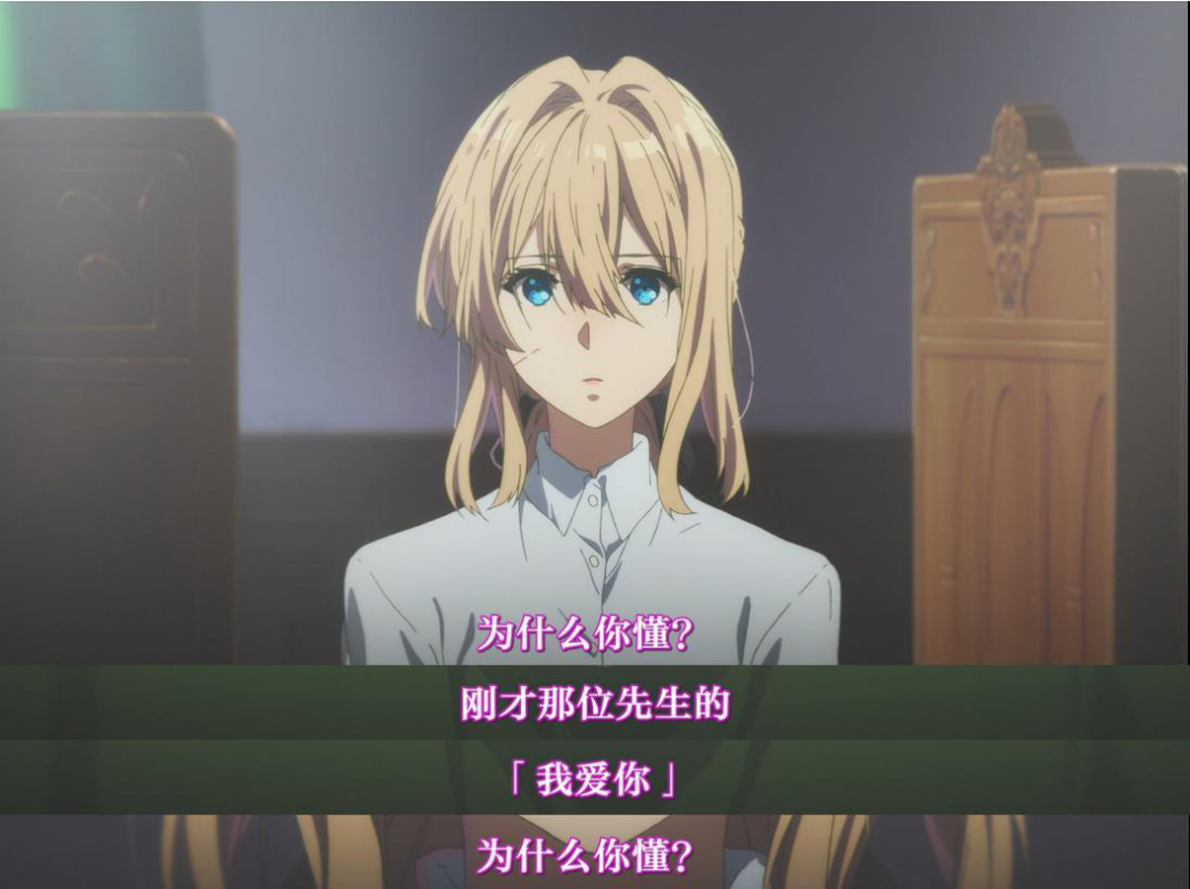 在這個戰後的世界,薇爾莉特依舊以一種戰場的行為模式活在戰後的世界裏,無需交流,沒有朋友,腦中接收到的只有命令,而語言裏也只有“明白”和“沒有問題”。