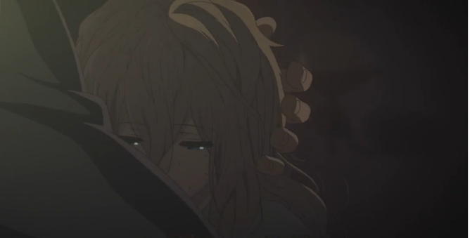 在聽到“我愛你”時薇爾莉特內心翻湧起感情,但這令她困惑。影片以一組極快的蒙太奇呈現了薇爾莉特的記憶——少校把她收養抱入懷裏,少校帶她在身後行軍出征、少校下令讓她衝去前線… 薇爾莉特不懂愛,但唯獨對少校的執念極其強烈。