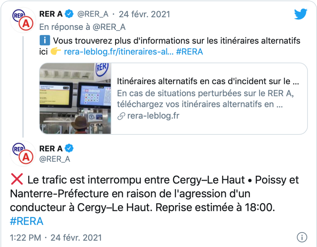 根據交通服務部門的推特,有人在Cergy-Le Haut車站襲擊一名司機後,致使整個RER A線的交通中斷。預計恢復時間是下午6點。