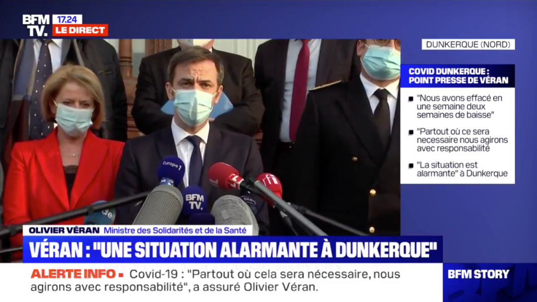 衞生部長奧利維爾·韋蘭(Olivier Véran)在週三下午前往敦刻爾克,並做出了限制行動的決定: