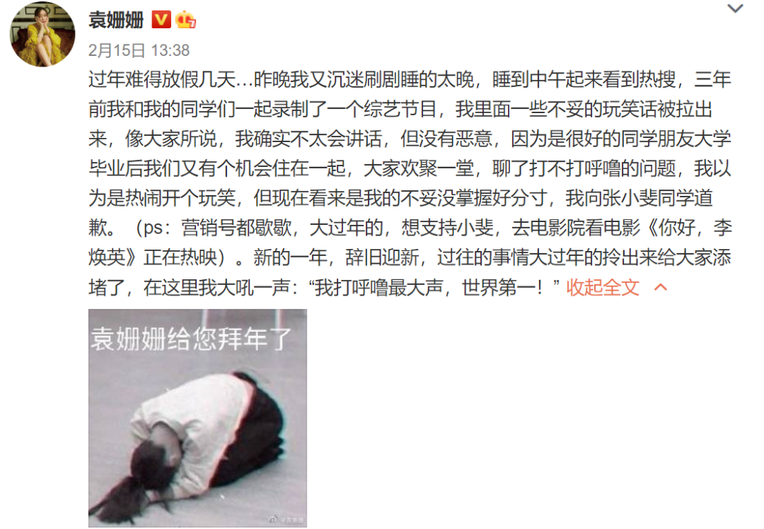 最近張小斐熱度高了,這事又被拿出來説了,袁姍姍就發了微博道歉,但並沒有人買賬,反而覺得她一點都不真誠,有蹭熱度之嫌。