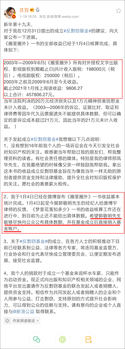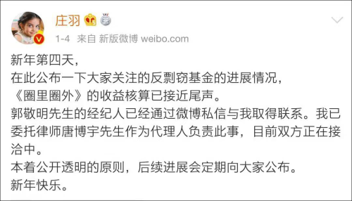 2021年1月4日,莊羽公佈反剽竊基金的進展情況:《圈裏圈外》的核算已接近尾聲,郭敬明方也已和她取得聯繫,雙方正在接洽中。